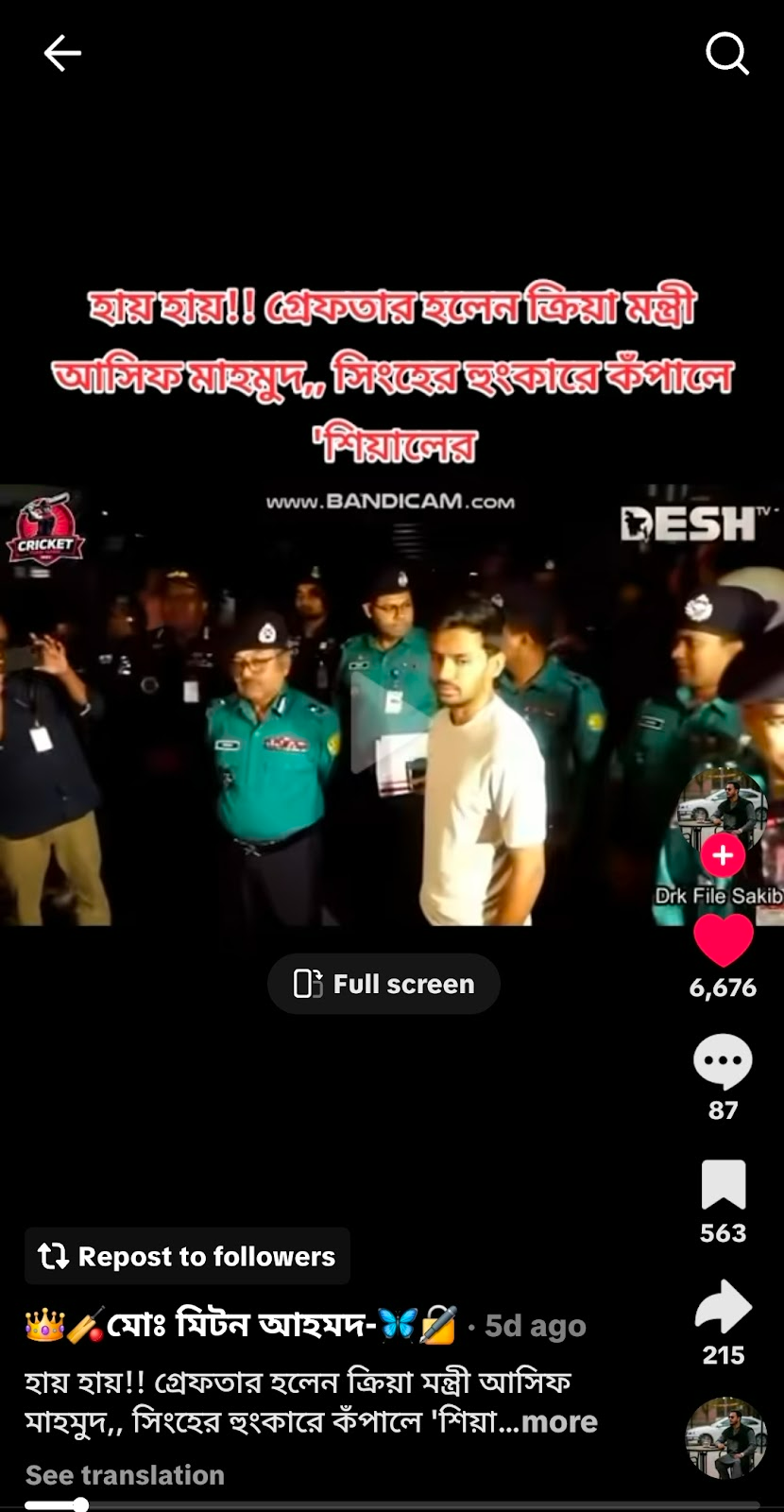 ‘আসিফ মাহমুদ, ক্রীড়া উপদেষ্টা গ্রেফতার’ দাবিতে সম্প্রতি সামাজিক যোগাযোগ মাধ্যম টিকটকে একটি ভিডিও প্রচার করা হয়। ভিডিওতে আসিফ মাহমুদ সবুজ ভুইঞাকে আইনশৃঙ্খলা বাহিনীর সাথে দেখা যায়। পোস্টটিতে আরও দাবি করা হয় সাকিব আল হাসান এর বিরুদ্ধে ফেসবুক পোস্টে অবস্থান নেয়ায় তাকে গ্রেফতার করা হয়।