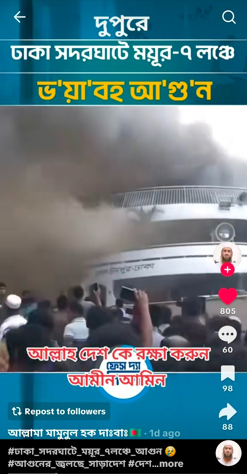 ভিডিওগুলোতে দাবি করা হচ্ছে, সদরঘাট লঞ্চ টার্মিনালে যাত্রীবাহী লঞ্চ ময়ূর-৭ এ আগুন লেগেছে।