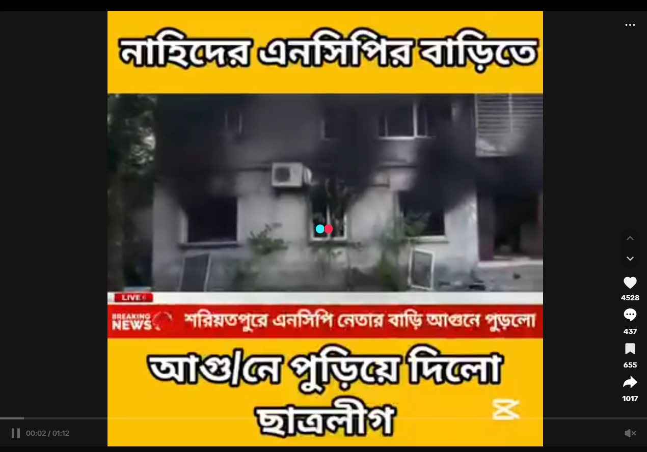 সামাজিক যোগাযোগ মাধ্যমে সম্প্রতি ছড়িয়ে পড়া একটি ভিডিওতে দাবি করা হয়েছে যে, শরীয়তপুরে জাতীয় নাগরিক পার্টি (এনসিপি)-এর এক নেতার বাড়িতে আগুন দিয়েছে নিষিদ্ধ ঘোষিত বাংলাদেশ ছাত্রলীগের নেতা-কর্মীরা।