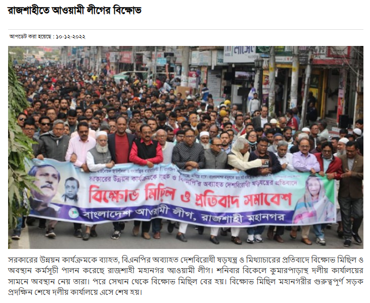 প্রতিবেদনে সংযুক্ত ছবির সঙ্গে আলোচিত দাবিতে প্রচারিত ফটোকার্ডের ছবির মিল পাওয়া গেছে। প্রতিবেদনে উল্লেখ করা হয়েছে, ২০২২ সালের ১০ ডিসেম্বর রাজশাহী মহানগর আওয়ামী লীগ ‘সরকারের উন্নয়ন কার্যক্রমে বাঁধা, বিএনপির অব্যাহত দেশবিরোধী ষড়যন্ত্র ও মিথ্যাচারের প্রতিবাদে’ বিক্ষোভ মিছিল ও অবস্থান কর্মসূচি পালন করে। কুমারপাড়াস্থ দলীয় কার্যালয়ের সামনে তারা অবস্থান নেয় এবং সেখান থেকে বিক্ষোভ মিছিল শুরু হয়। পরে মহানগরীর গুরুত্বপূর্ণ সড়ক প্রদক্ষিণ করে মিছিলটি পুনরায় দলীয় কার্যালয়ে এসে শেষ হয়।